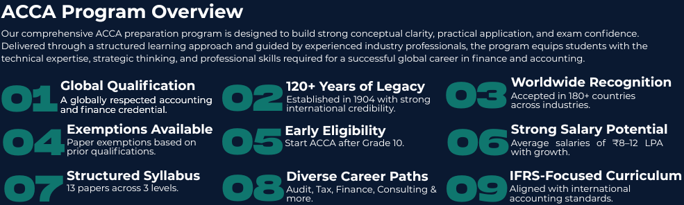 Our comprehensive ACCA preparation program is designed to build strong conceptual clarity, practical application, and exam confidence. Delivered through a structured learning approach and guided by experienced professionals, the program equips students with the skills required for a successful global career in finance and accounting.